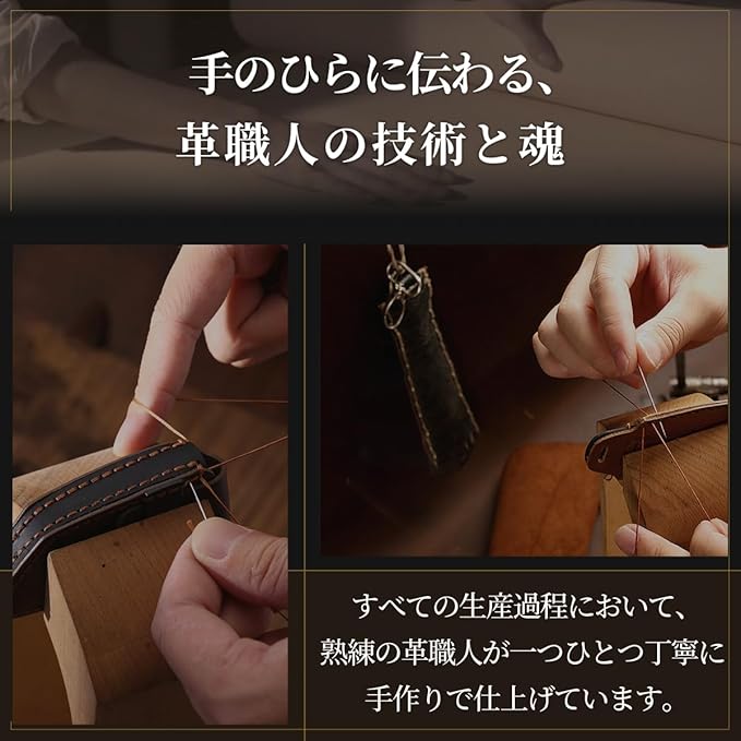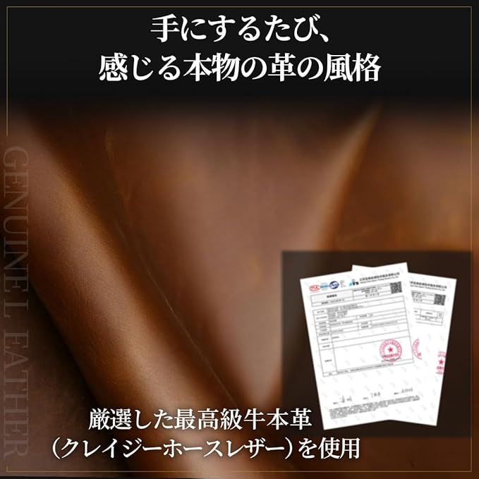 【厳選した最高級牛革を採用】クレイジーホースレザーを採用し、至極の手触りとぬくもりを手に入れることができます。使えば使うほどレザーが柔らかく、色艶を増し、商品が唯一無二の存在に昇華されます。あなたと過ごした時間が味となり、素敵な相棒となるでしょう。