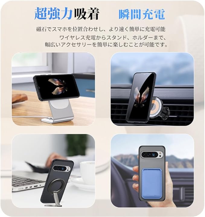 【MagSafe対応・強力な磁力吸着】ケース背面にマグネットを内蔵しているので、MagSafe充電器等にしっかり吸着、マグネットによる正確な位置合わせで、ワイヤレス充電がこれまでよりもすばやく簡単に完了します。また、すべての MagSafeアクセサリ(ウォレット、リングホルダー、パワー バンクなど、車用マウント)ワイヤレス充電対応と完全に互換性があります。