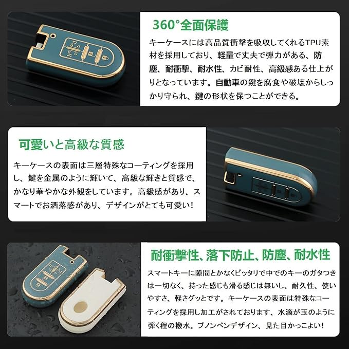 【360 全面保護】キーケースには高品質衝撃を吸収してくれるTPU素材を採用しており、軽量で丈夫で弾力がある、防塵、耐衝撃、耐水性、着地緩衝の効果があります。キーケースの表面は特殊なコーティングを採用し加工がされております、水滴が玉のように弾く程の撥水、自動車の鍵を腐食や破壊からしっかり守られ。360 全面保護、するため 落としてもキーに 傷がつくことはありません。