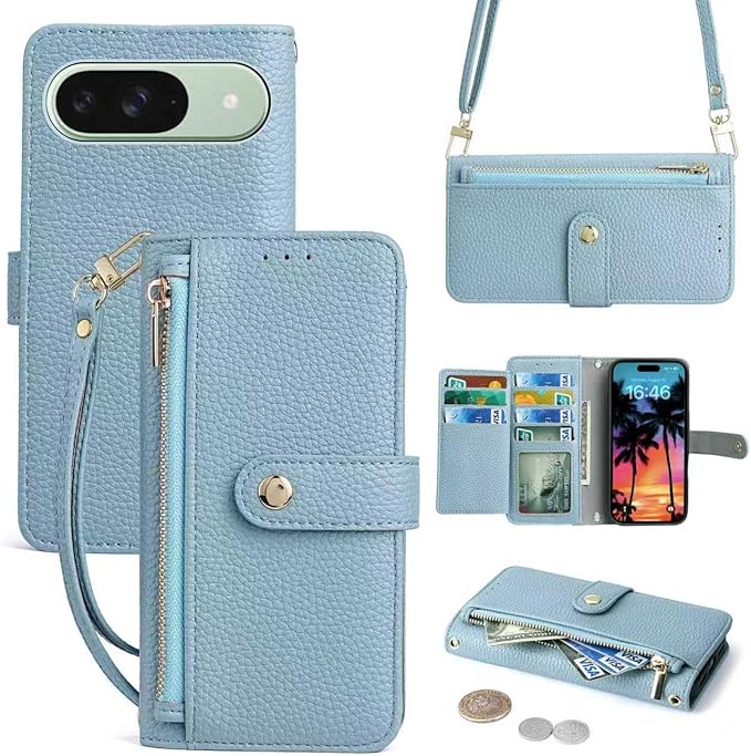Vokpok対応 Google Pixel 10/10 Pro ケース 手帳型 ショルダー 強力マルチカード収納 スタンド機能 グーグルピクセル 9/9 Pro 財布型ケース 肩掛け 斜めがけ 手首かけ、掛けストラップ付き おしゃれ 実用性 ジッパー小銭入れ Pixel 9/9 Pro スマホケース PUレザー ある滑らかな手触り ピクセル10/10 Pro ケース, ライトブルー | KAZESHOP