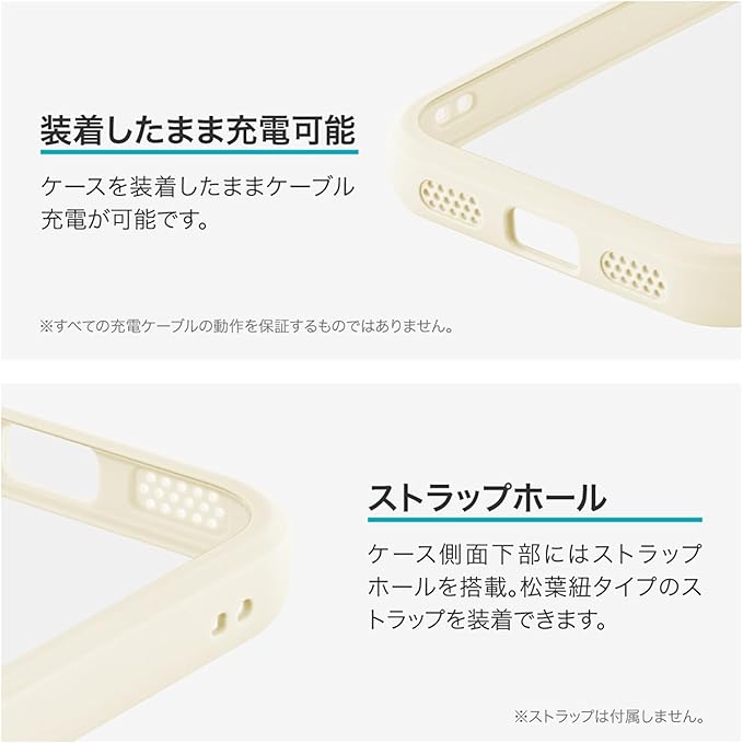 【もっと便利に】ケース側面下部にはストラップホールを搭載。松葉紐タイプのストラップを装着できます。更にケースを装着したままケーブル充電が可能です。※全て充電ケーブルの動作を保証するものではありません。