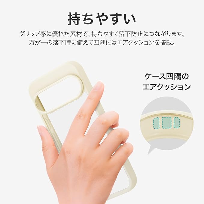 【持ちやすく、使いやすい】側面のTPUはグリップ感に優れ、持ちやすく落下防止に繋がります。万が一の落下時に備え、四隅にはエアクッションを搭載。
