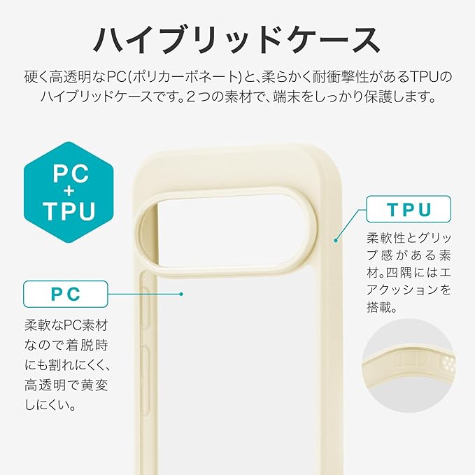 【ハイブリッドケース】硬く透明度の高いPC(ポリカーボネート)と、柔らかく耐衝撃性があるTPUのハイブリッドケースです。2つの素材で端末をしっかり保護します。【耐傷・耐衝撃】ケース背面は硬く透明度の高いPC(ポリカーボネート)です。傷に強く、黄変しにくい素材です。側面は柔軟性があるTPU素材で、四隅にはエアクッションを搭載。落下時に多い角への衝撃に備えます。【持ちやすく、使いやすい】側面のTPUはグリップ感に優れ、持ちやすく落下防止に繋がります。万が一の落下時に備え、四隅にはエアクッションを搭載。【精密設計】カメラレンズ周囲を高く設計することでレンズを保護。ボタン周囲までカバーする精密設計で、細かな傷やホコリから守ります。【もっと便利に】ケース側面下部にはストラップホールを搭載。松葉紐タイプのストラップを装着できます。更にケースを装着したままケーブル充電が可能です。※全て充電ケーブルの動作を保証するものではありません。
