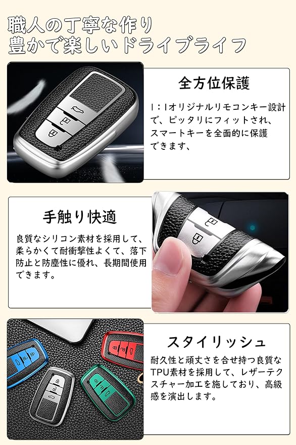 【高級な素材】良質なTPU素材を採用しており、摩擦に強く、割れにくく、軽くて長持ちし、車のキーをキズや摩耗を防止、全面的保護します。キーケースの形を綺麗に保ちつつ、柔軟なTPU素材で防塵、耐衝撃、高級感ある仕上がりとなっています。綺麗な色は気持ちを楽しませてくれます。