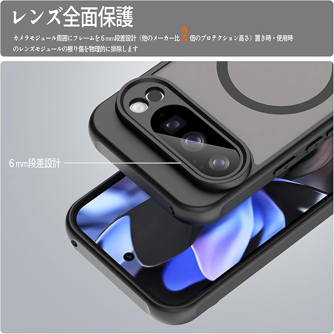 【素材・デザイン】本製品は、高硬度PC素材のベースプレートと高靭性強化TPU素材のフレームを組み合わせ、ハイブリッド技術と精密金型成形で製造。ケースとスマホ本体の全てのポート位置が精密に合致し、ボタン部分のくり抜き設計により、装着時でも操作感を損なわず快適に機能をお使いいただけます。