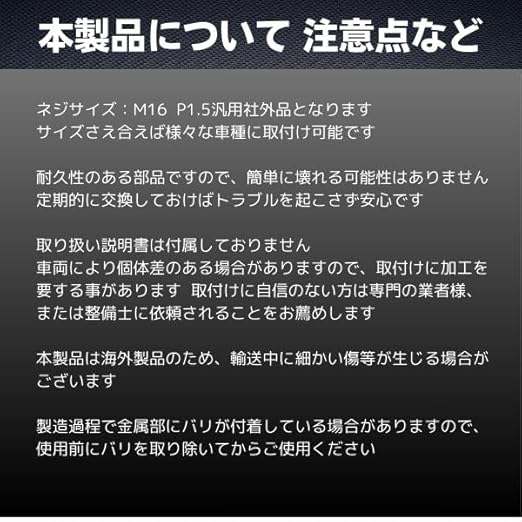 取扱説明書は付属しておりません 車両により個体差のある場合がありますので、取り付けに加工を要する事があります 取り付けに自信のない方は専門の業者様、または整備士に依頼して取り付けされることをお薦めします