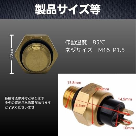 85℃ロー添付サーモファンスイッチM16-P1.5汎用社外品です ラジエターのロワタンク・冷却水通路に取付されているスイッチとなる部品です ラジエター内の温度が高温過熱になりエンジンブローしないように、電動ファンのON・OFFを設定温度でコントロールする役割があります