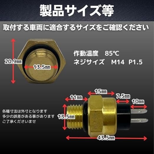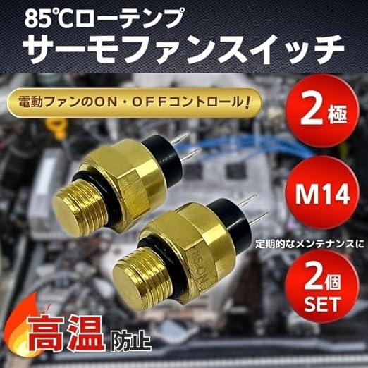 【商品概要】このローテンプサーモファンスイッチは、M14 P1.5サイズの汎用社外品です ラジエーターのロワタンクや冷却水通路に取り付けることで、エンジンのオーバーヒートを防止します 設定温度(85℃)で電動ファンの「ON・OFF」をコントロールし、エンジンが過熱しないように保護する重要な部品です