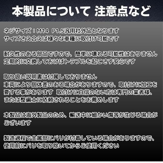 【サイズ・適合】サイズ:ネジサイズ:M14 P1.5 汎用品なので、ネジサイズさえ合えば、さまざまな車種に対応可能です バリエーションは、1個セットとお得な2個セットです