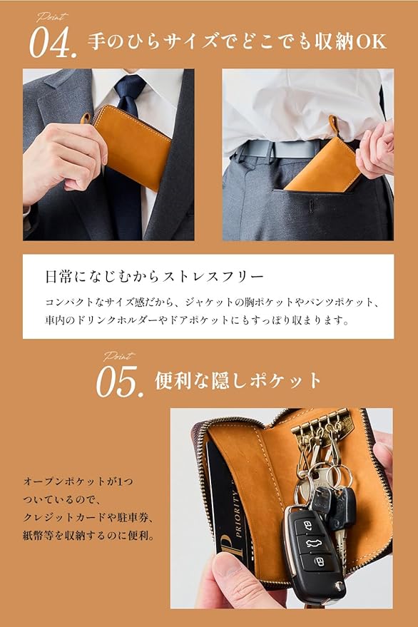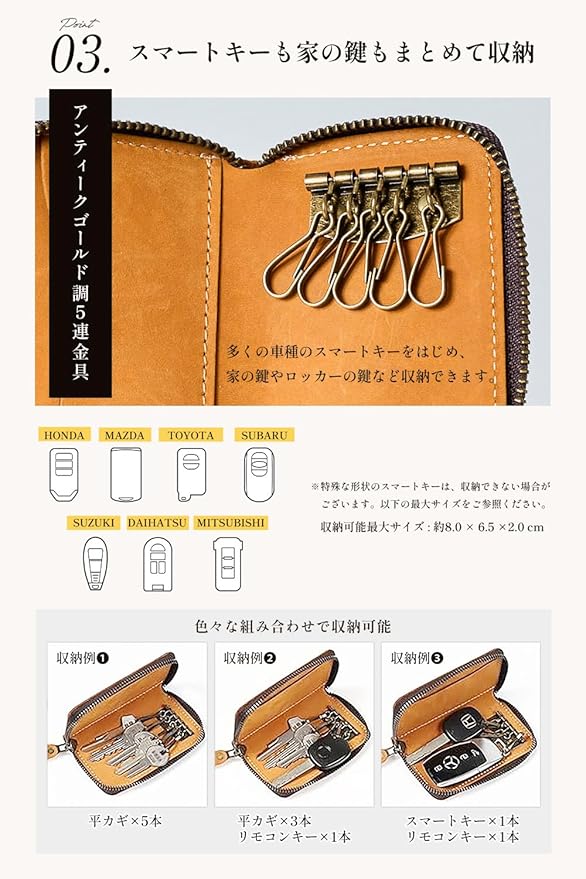 【様々な車種のスマートキーが収納可能】 国産車、外国車問わず多くの車種のスマートキーが収納可能です。【色々な組み合わせで収納可能】 収納例① 平カギ 5本 収納例② 平カギ 3本 リモコンキー 1本 収納例③ スマートキー 1本 リモコンキー 1本