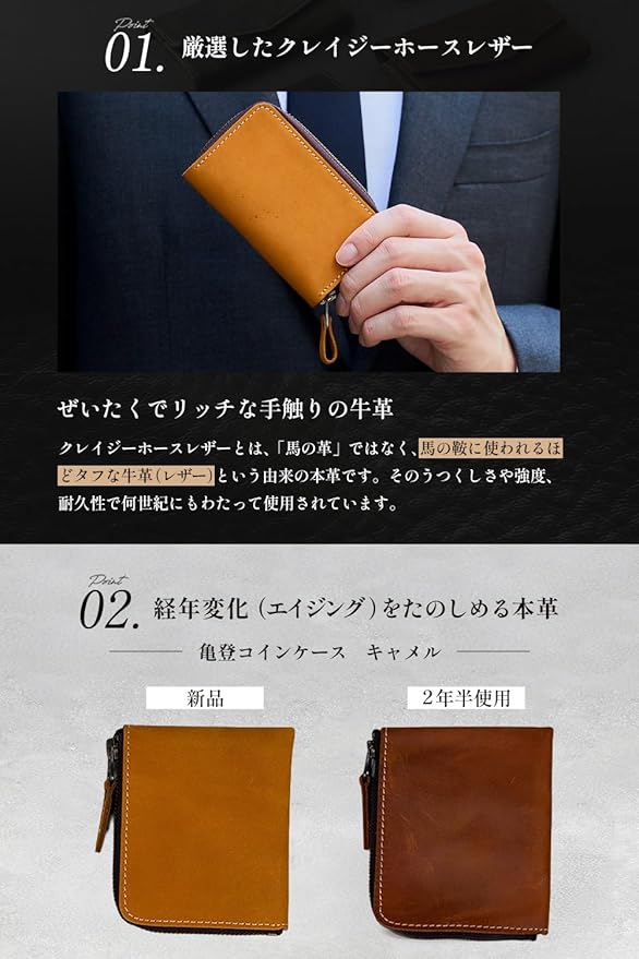 【経年変化を楽しむ】小銭入れの牛革表面が摩耗することで、革の色調が変わり、革表面に豊かで多彩な光沢が生まれます。そして肌からの油もまた革に美しい光沢を加える材料になります。