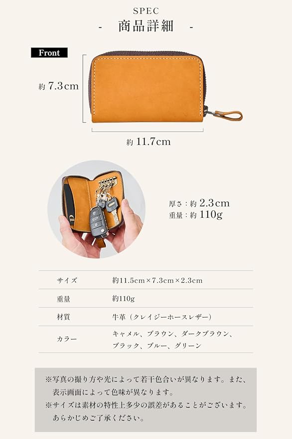【本革クレイジーホースレザー】牛革の最表面の皮を使用したキーケース。牛革の最表面の皮は繊維が細かく、頑丈で耐久性にすぐれています。本革の中でもクレイジーホースレザーと呼ばれる革を使用して作られています。クレイジーホースレザーは品質の良い牛の原皮(馬の皮ではありません)を使用し、植物性タンニンで鞣した皮でしっとりとしたやや起毛したような質感が特徴的なレザーです。当スマートキーケースは起毛加工技術を採用し作られており、手触りが滑らかで耐久性にも優れています。「思わず誰かに見せたくなる」そんな革製品を目指して作りました。