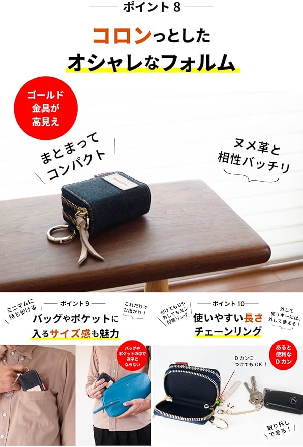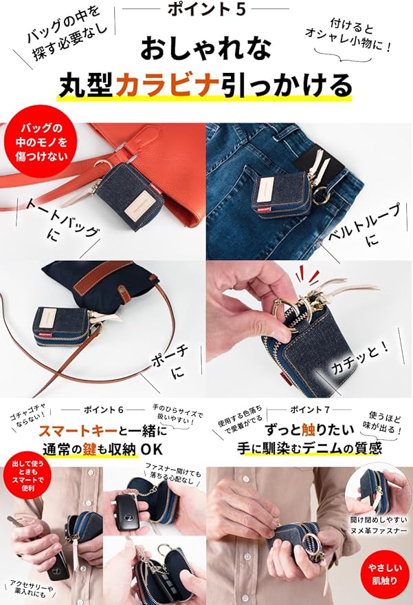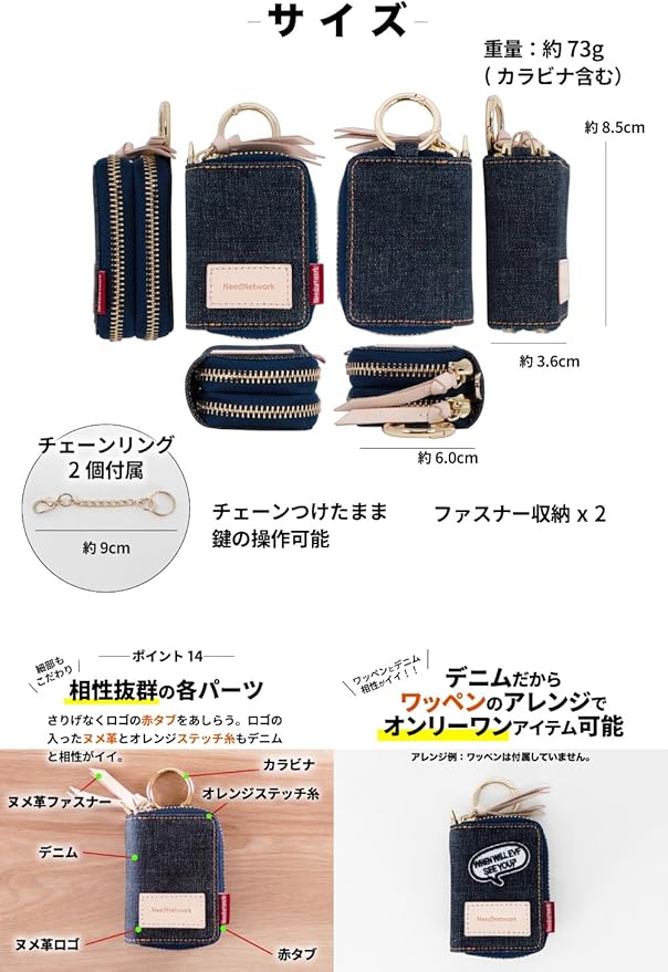 【デニム好きには、たまらない】あなただけの色落ちを楽しむ。スマートキーケース 車と家のスマートキーが1つにまとまる ▶︎マルっと入れて使いやすい。 キーを入れたままでスムーズに出入り ▶︎複数の鍵の持ち運びに便利。 世界でも名高い日本製デニムから厳選したデニム生地を使用したキーケース ▶︎この高品質なデニム生地は、海外のモノを圧倒する品質レベル。腕利きの職人が一切の妥協を許さない 使い込むほど味が出る ▶︎色落ちの風合いは、一般的なデニム生地と比べものにならない。自分だけのオンリーワンに育てるならコレ。 おしゃれな丸型カラビナで引っ掛ける ▶︎バッグの中を探す必要なし。 スマートキーと一緒に通常の鍵も収納OK▶︎ ファスナー開けても落ちる心配なし。 コロンとしたおしゃれなフォルム▶︎ ゴールド金具が高見え。 バッグやポケットに入るサイズ感が魅力▶︎ ミニマムに持ち歩ける。 使いやすい長さのチェーンリング ▶︎付けてもヨシ外してもヨシの付属リング。 サイズ、横 約6.0cm 縦 約8.5cm 厚さ3.6cm ■重量、約73g(カラビナ含む)