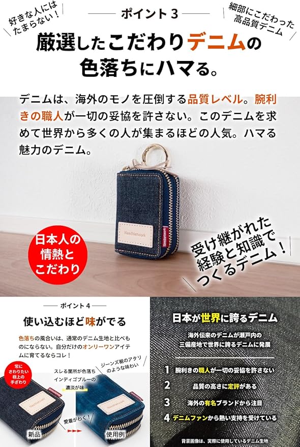職人が手間暇を惜しまず作り出す藍染めの美しい色は、使い込んだ「色落ち」の風合いや表情も一般的なデニム生地とは比べものにならない。。摩擦でデニムが最高の色落ちをして自分だけのオンリーワンアイテムに育つのも魅力のひとつ。 通常ありがちなチープ素材のファッション小物は使い込むと使用感がハンパなくすぐボロボロなりますが、当商品は、デニム素材のスレ感で逆に味が出て愛着がUP。 独特の深みがある経年変化の風合いはよくあるデニム素材とはモノが違う。