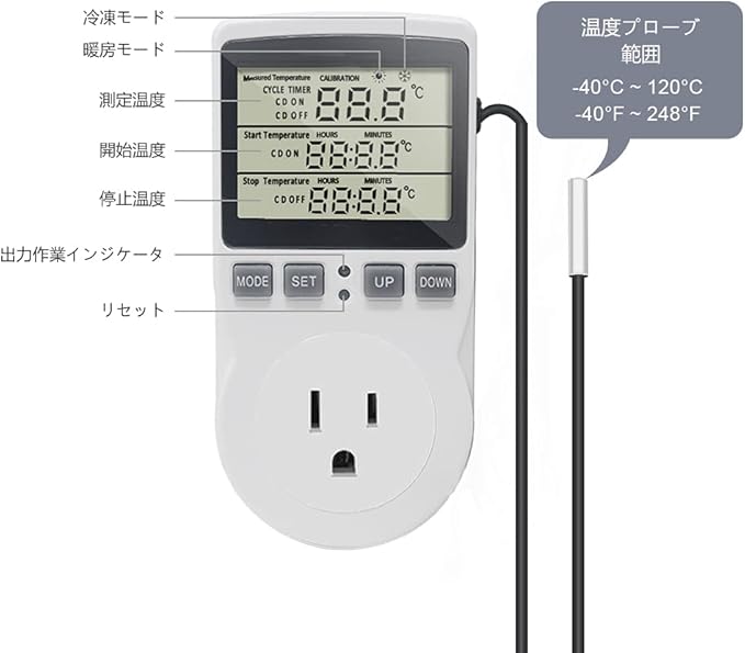 【温度制御モード】サーモスタットの開始温度と停止温度を設定して、暖房または冷房設備を制御します。温度コントローラーの入力は120VAC 50 / 60Hz、出力は15A 1800Wで、ほとんどの家電製品に適しています。