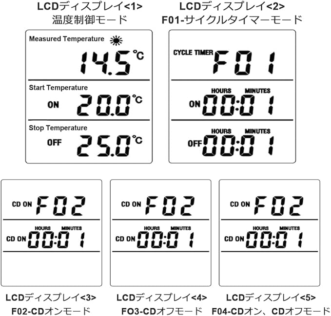 【スマートタイミングモード】 サーモスタットタイマーソケットには、F01-F04モード、F01サイクル時間制御モード、F02カウントダウンオンモード、F03カウントダウンオフモード、F04カウントダウンオン、カウントダウンオフモードがあり、時間範囲は0〜99時間59分です。