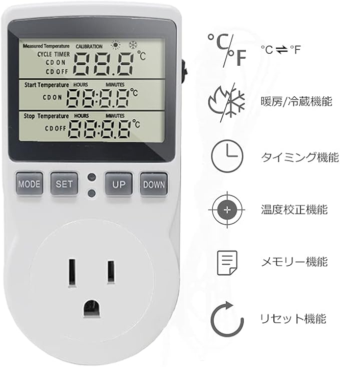 【各種機能】 暖房/冷蔵機能; C /℉切り替え可能な機能; F01-F04タイミング機能; -9.9〜9.9℃/℉温度校正機能; 記憶機能; リセット機能