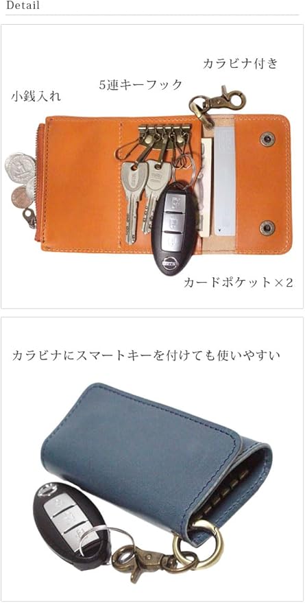 小銭入れ、カラビナなどを装備しシンプルでありながら機能的なキーケースに仕上がった。