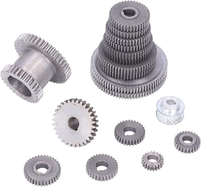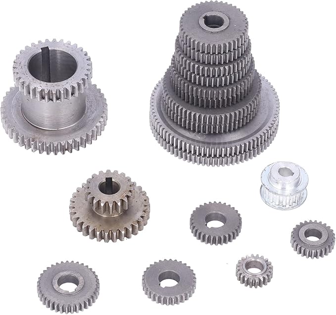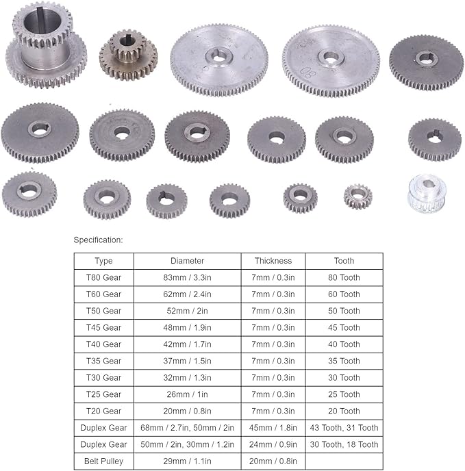 機能: 1。 18PCS IN 1セット:歯数とサイズが異なり、実用性に優れた18個の金属歯車を含みます。 2。優れた材料:優れたHT250ねずみ鋳鉄材料でできており、表面は防錆性があり、耐摩耗性と耐食性があります。 3。複数のタイプ:より多くの処理ニーズを満たすために、2個のデュプレックスギアとモーターベルトプーリーが装備されています。 4。ファインプロセッシング:これらの歯車は、ファインミリング技術を使用して研磨し、高精度と安定性を確保します。 5。旋盤アクセサリ:CJ0618ミニ旋盤または金属切削機に広く使用されており、互換性があります。 仕様: アイテムタイプ:ギアキット 材質:HT250グレーアイアン 仕様: タイプ直径厚さ歯T80ギア83mm / 3.3in 7mm / 0.3in80歯T60ギア62mm / 2.4in 7mm / 0.3in60歯T50ギア52mm / 2in 7mm / 0.3in50歯T45ギア48mm / 1.9in 7mm / 0.3in45歯T40ギア42mm / 1.7in 7mm / 0.3in 40トゥースT35ギア37mm / 1.5in 7mm / 0.3in35トゥースT30ギア32mm / 1.3in 7mm / 0.3in30トゥースT25ギア26mm / 1in 7mm / 0.3in25トゥースT20ギア20mm / 0.8in 7mm / 0.3in20トゥースデュプレックスギア68mm / 2.7in、50mm / 2in 45mm / 1.8in 43歯、31歯デュプレックスギア50mm / 2in、30mm / 1.2in 24mm / 0.9in 30歯、18歯ベルトプーリー29mm / 1.1in 20mm / 0.8in パック影リスト: 2xT80ギア 2xT60ギア 2xT50ギア 2xT45ギア 2 xT40ギア 2xT30ギア 1xT35ギア 1xT25ギア 1x T20ギア 2xデュプレックスギア 1xモーターベルトプーリー