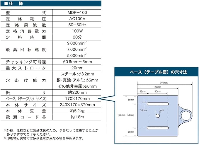軟金属や木材、プラスチックやアクリル等の垂直穴あけ作業に