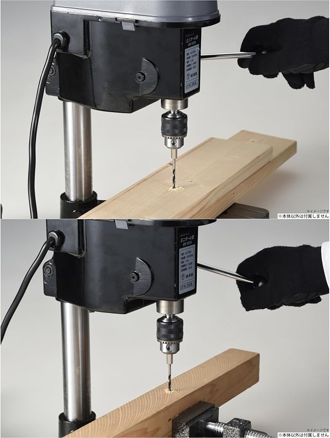 【セット内容】ミニボール盤本体 1(支柱・クランクボルトは出荷時取付済)、ベース 1、ハンドル 1、チャックハンドル 1、バイス 1、バイス用ボルトセット(ワッシャー2枚・ナット付) 2、六角棒レンチ2.5mm/4mm 各1、取扱説明書 1