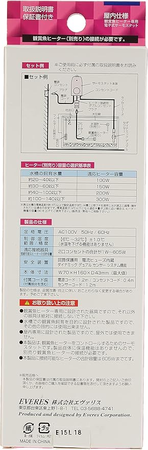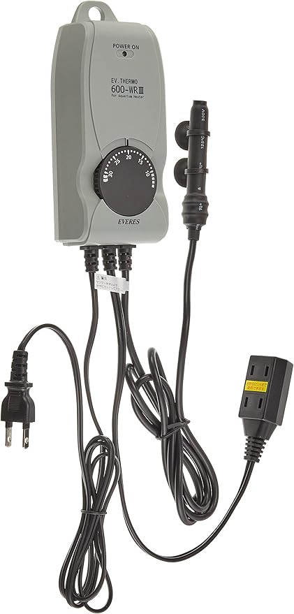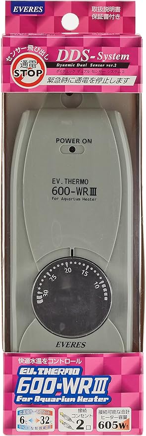 低温6℃~高温32℃まで温度設定可能なサーモスタット。低温6℃から高温32℃までのワイドなレンジで温度設定が可能。微妙な温度調節を必要とするプロのブリーディングにも適応。水槽内の水流が少ない時も誤作動を起こしにくい大型センサーを採用。全く新しい思考型センサーの搭載で、水替え時のセッティング異常、水槽の水漏れ等、万が一、センサーが空気中に露出すると電源を緊急停止する機能を搭載。*センサーを正常な状態に戻すと機能は自動的に復帰されます。電子回路を過電流から守る電流ヒューズを内蔵。本体内部に高効率のヒートシンクを採用し、放熱スリットを排除。湿気・ホコリから本体を保護する構造を実現。接続ヒーター用2口コンセント採用。ヒーター2台まで(合計容量605Wまで)の接続が可