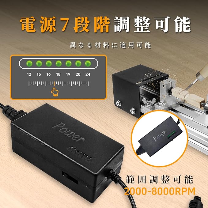 【商品セット】旋盤*1、7速電源アダプター*1、ドリルチャックキー*1、ネジ固定ピン*1、六角仏壇固定ピン*3、彫刻刀3点セット*1(適用木材:松やプラタナスなどの柔らかい木材に適しています。)。堅木に彫刻をする場合は、専用の硬木彫刻刀をご使用ください。