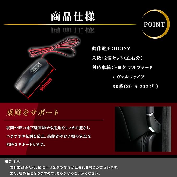 商品仕様 : 動作電圧:DC12V 入数:2個セット(左右分) 対応車種:トヨタ アルファード / ヴェルファイア 30系(2015-2022年)