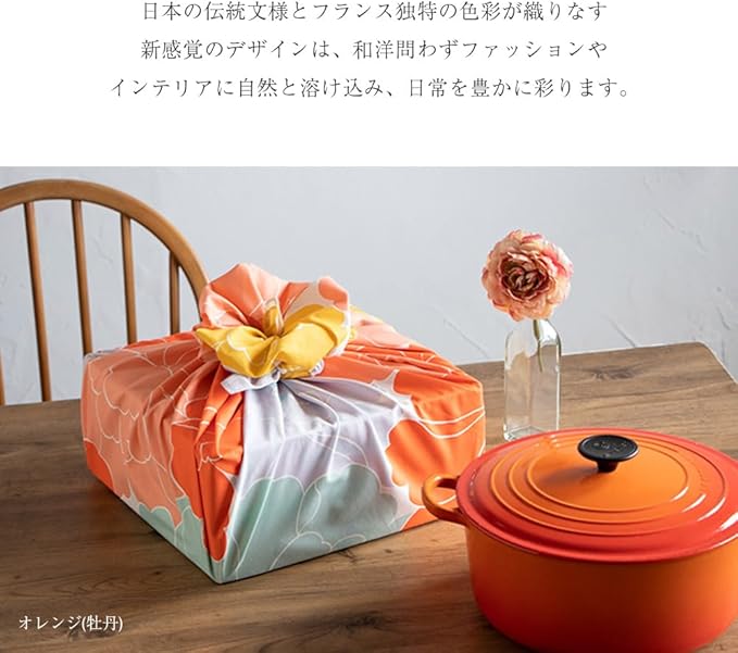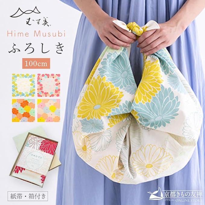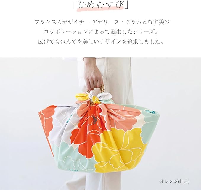 パリ在住フランス人デザイナー アデリーヌ・クラムとのコラボレーションによって誕生したシリーズ「ひめむすび」。 オーガニックコットンを素材に、広げても包んでも美しいデザインを追求しました。 日本の伝統文様とフランス独特の色彩が織りなす新感覚のデザインは、 インテリアやファッションとも相性が良く、和洋問わず自然と溶け込むシリーズです。バック使いはもちろん、ショールのように羽織ったり、クッションカバーやインテリアファブリックにもお使いいただけます。 帯・専用箱付きで、プレゼントにもおすすめです。