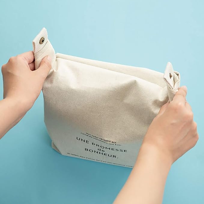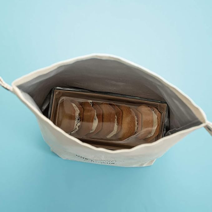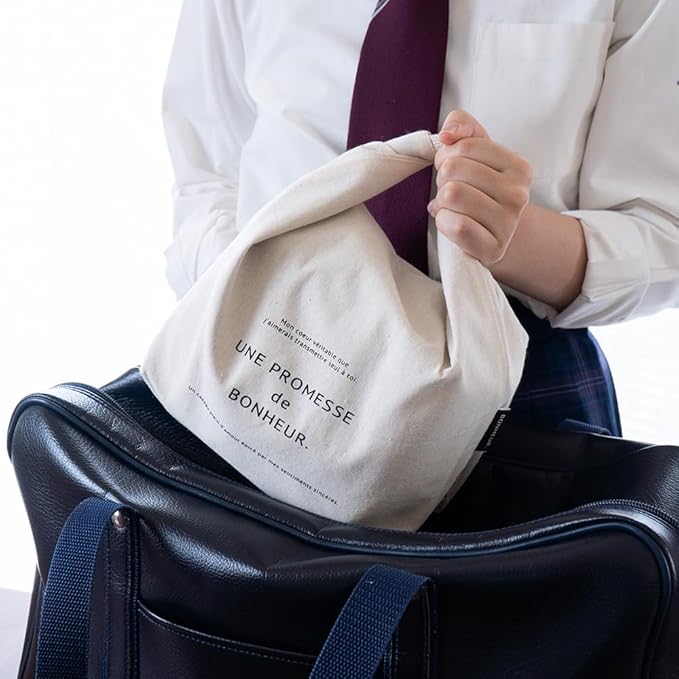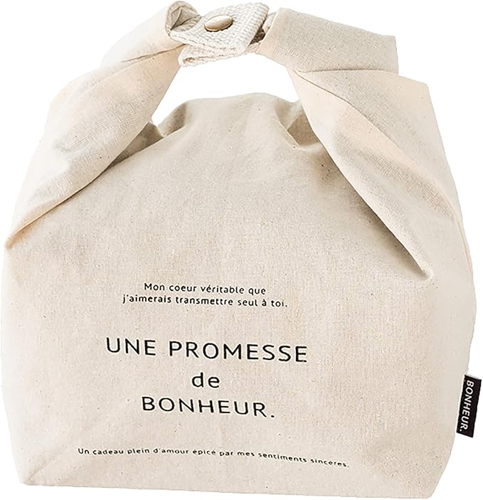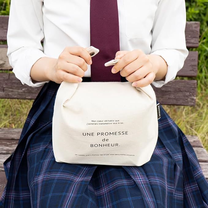 内側が撥水加工のバッグです。上の部分をくるっと巻いて留めることができます。軽い保冷効果があり、お弁当箱袋などのリユースにもおすすめ。ゼリーのスタンドバッグが8個入るほど良い大きさとコロリとしたフォルム、帆布のザックリとした風合いが、シンプルなボヌールシリーズのデザインを引き立てる使いやすい布バッグです。