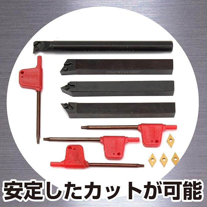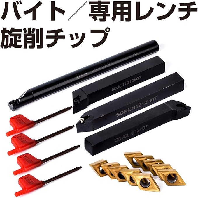 セット内容:旋削チップ(DCMT070204) 10個、バイト 4種(S12-SDUCR07、SDJCR121H07、SDNCN1212H07、SDJCL1212H07)、レンチ 4 ※モニターの環境により、色の見え方に若干差が生じる場合があります。