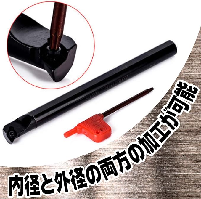 今回はこの切削チップを取り付け際に必要なS12-SDUCR07、SDJCR121H07、SDNCN1212H07、SDJCL1212H07の4種類のバイトと専用のレンチも付属しています。スローウエアバイトなので低速下で安定したカットができます。