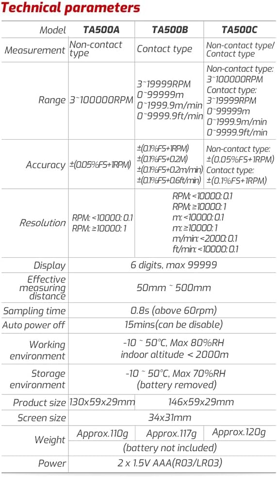TA500B;コンタクト;3~;19999RPM、0~;99999m、0~;1999.9m/min、0~;9999.9ft/min