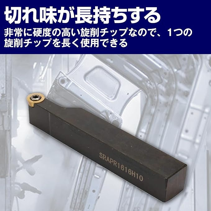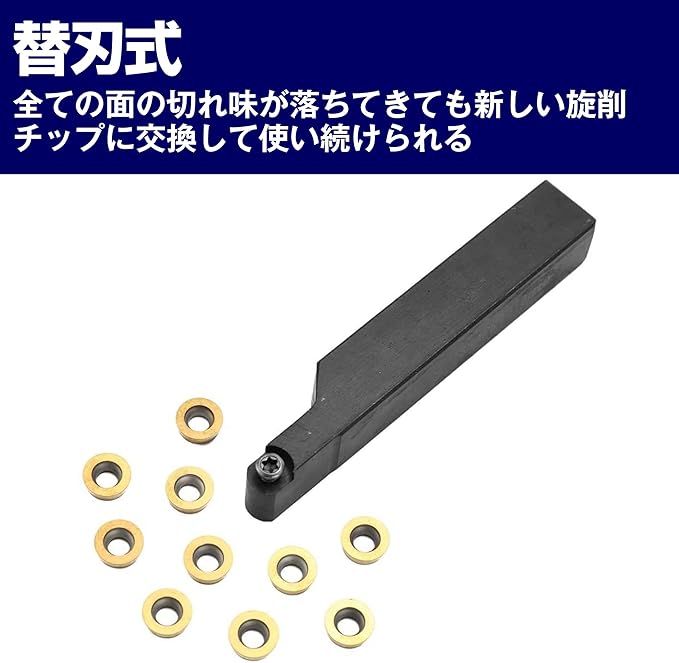 面倒な研ぎ作業が不要:全ての面の切れ味が落ちてきても、新しい旋削チップに交換して使い続けられる替刃式の旋盤ターニングツールです。面倒な研ぎ作業が不要で、交換用の旋削チップも付属しているので、使いやすいです。