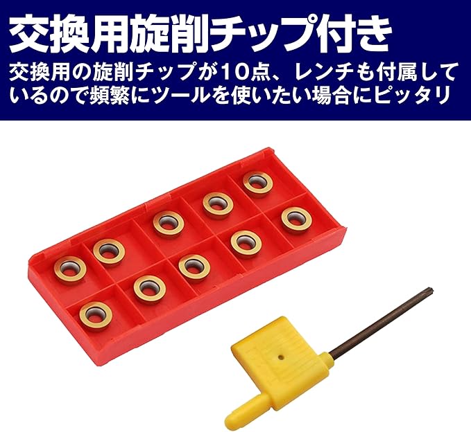 交換用旋削チップが10点付属:こちらの旋盤ターニングツールには、交換用の旋削チップが10点付属しています。頻繁にツールを使いたい場合にピッタリの商品です。また交換時に必要となるレンチも付属しています。