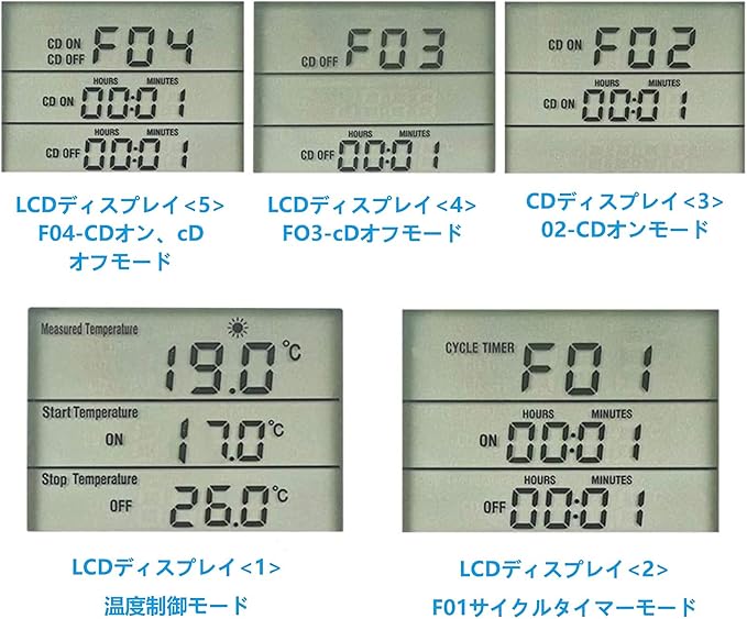4.マルチモード選択:温度制御モード、F01サイクルタイマーモード、F02カウントダウンオンモード、F03カウントダウンオフモード、F04カウントダウンオン、カウントダウンオフモードの5つのモードから選択できます。両方のモードを同時に実行することはできないことに注意してください。システムは、現在表示されているモードでのみ動作します。タイミング機能と温度制御機能を同時に使用することはできません。