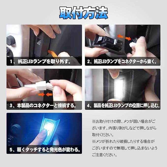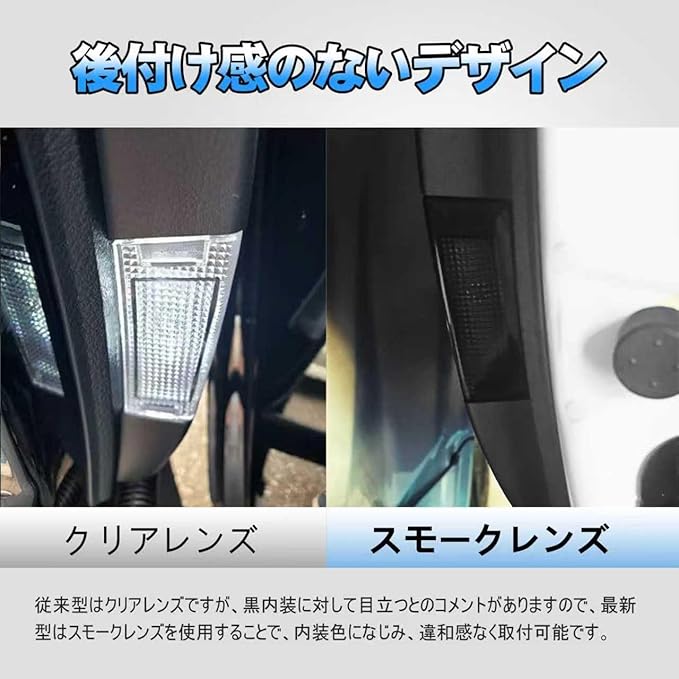 【ワンタッチで発光色を切替】タッチセンサーを内蔵しておりますので、スモークレンズ表面を軽くタッチすると発光色がホワイト/アイスブルーで切替可能です。直感的に操作できます。純正LEDカーテシランプのチップが1つしかないため明るさがちょっと物足りないが、本製品はLEDチップ数が一気に12個に増えました。より大きい基盤により数多くLEDチップを配置することで、純正ランプをはるかに超える明るさを実現しました。