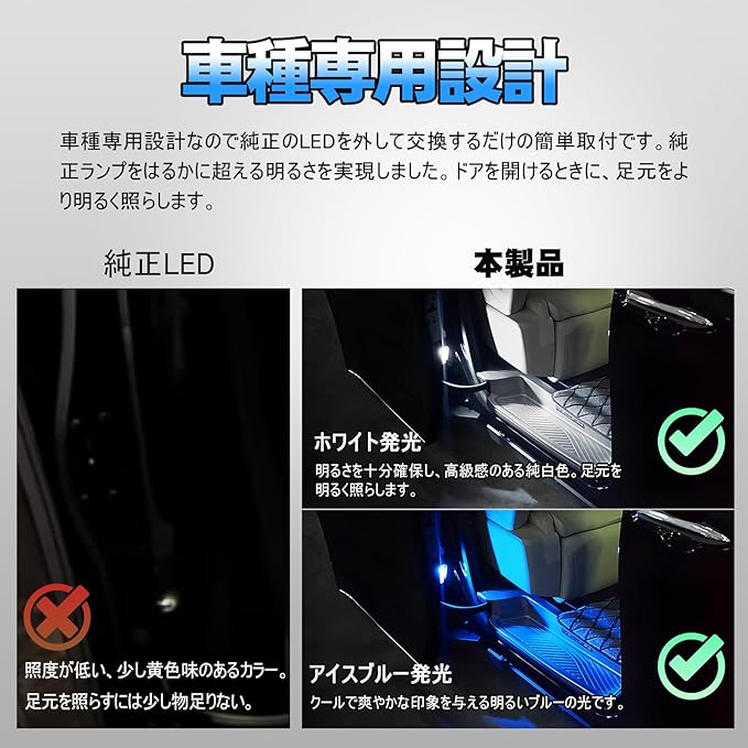【対応車種】アルファード 40系AAHH4#W/AGH4#W R5.6~、ヴェルファイア 40系AAHH4#W/TAHA4#W R5.6~。セット内容:カーテシランプ 2 、内張りはがし 1、取付説明書 1。車種専用設計なので純正のLEDを外して交換するだけの簡単取付です。