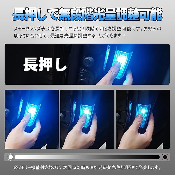 【長押しで無段階光量調整可能】スモークレンズ表面を長押しすると無段階で明るさ調整可能です。お好みの明るさに合わせて、最適な光量に調整することができます!※メモリー機能付きなので、次回点灯時も消灯時の発光色と明るさで発光します。