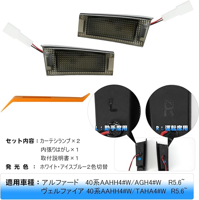 アルファード40系 カーテシランプ 2列目 ヴェルファイア 40系 40アルファード スライドドアスポットランプ ステップランプ 爆光ドアウェルカムライト 後席スライドドア用 車種専用設計 純正交換 カプラーON設計 取付簡単 AGH4#W/AAHH4#W/TAHA4#W 取付工具付き 左右2個セット ホワイト/アイスブルー2色切替 明るさ調整可能 (スモークレンズ) | KAZESHOP