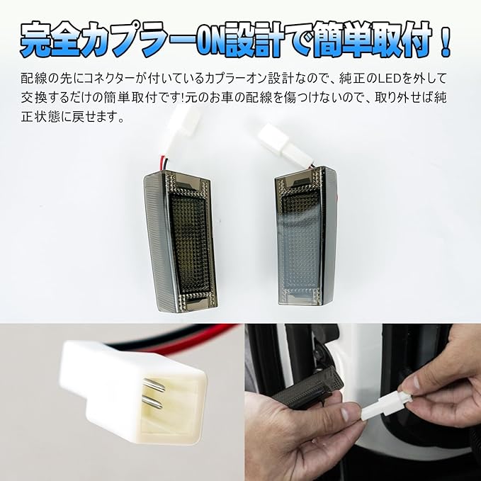 【完全カプラーON設計で簡単取付!】配線の先にコネクターが付いているカプラーオン設計なので、純正のLEDを外して交換するだけの簡単取付です!元のお車の配線を傷つけないので、取り外せば純正状態に戻せます。