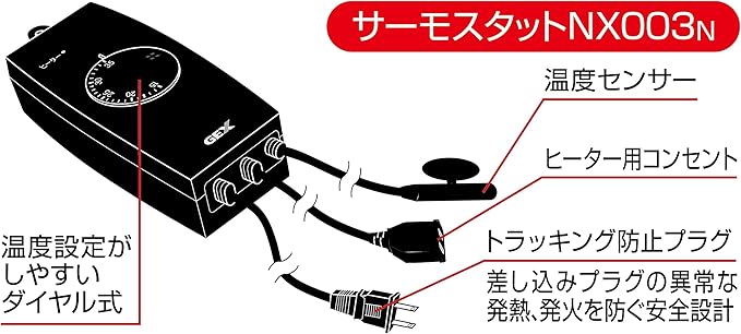 ヒーターの容量に応じて選べるサーモスタットで、本製品は300Wまでのヒーターをつなぐだけで水槽内を自動保温します。