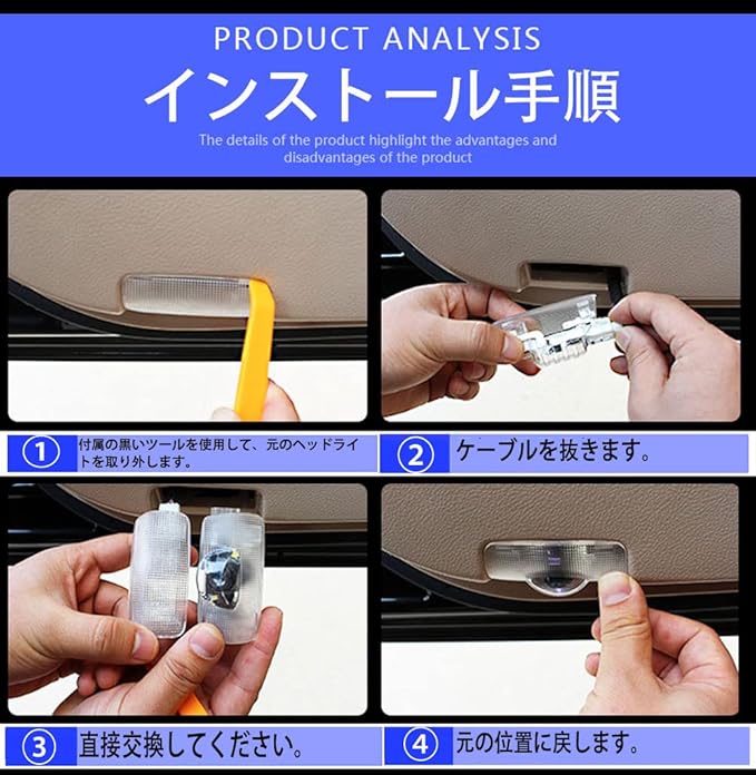 『取り付け簡単』:交換は簡単で、ケーブルがなく、古いドアのランプだけを交換します。ドアを開けると、マークは地上に投影される。注:車両にドア照明がない場合は、ウェルカム ランプを設置することは推奨されません。ご注意ください!