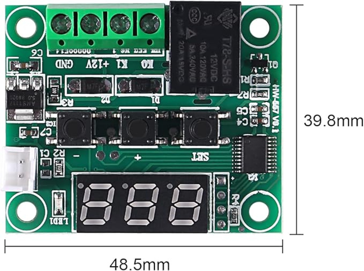 電源:DC 12V、温度制御モード:ON/ OFF、温度範囲:-50~110℃、温度測定精度:0.1℃、3桁7セグLED表示器に温度をリアルタイムに℃で表示させます。