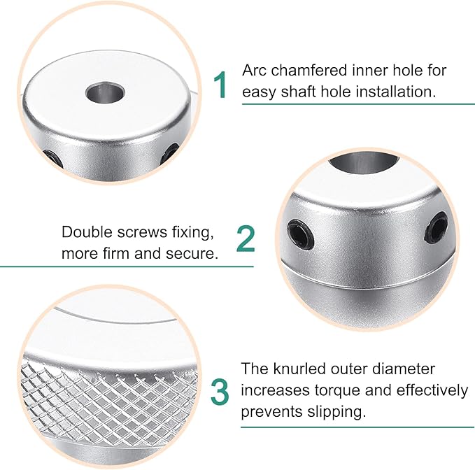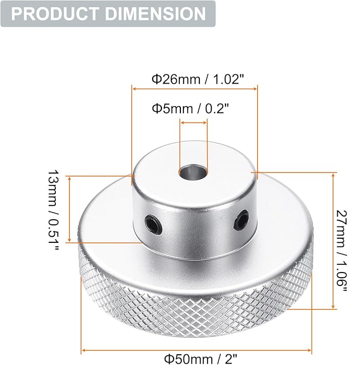 サイズ - 外径:50mm / 2"、ボア:5mm / 0.2"、高さ:27mm / 1.06"。軸を固定するための2本のネジが付属しており、より確実な固定を保証します。