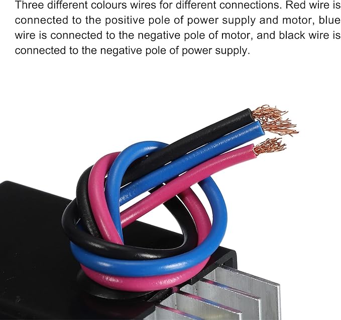 異なる接続のための3つの異なる色のワイヤー。赤い線は電源とモーターの正極に接続され、青い線はモーターの負極に接続され、黒い線は電源の負極に接続されます。