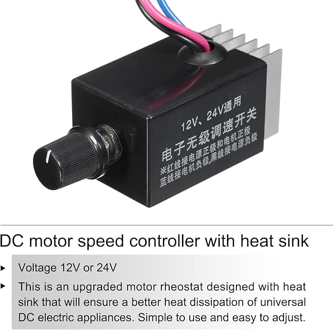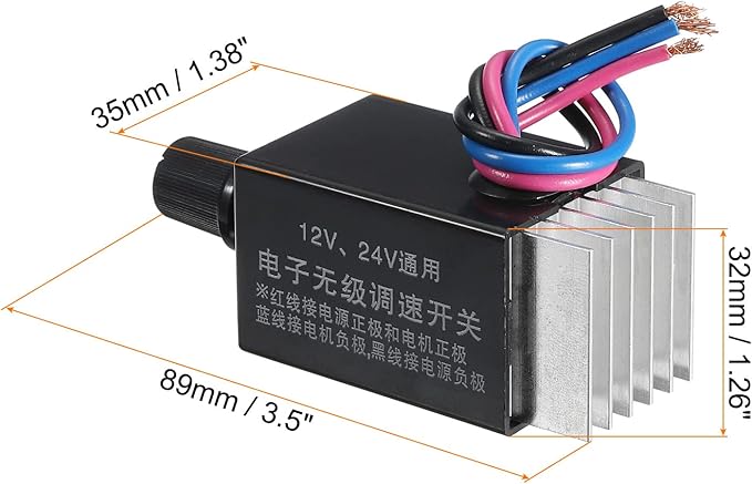 全体寸法:89 x 32 x 35mm(L*W*H); 電圧: 12V または 24V; パッケージの内容:1 x ヒートシンク付きDCモーター速度コントローラー