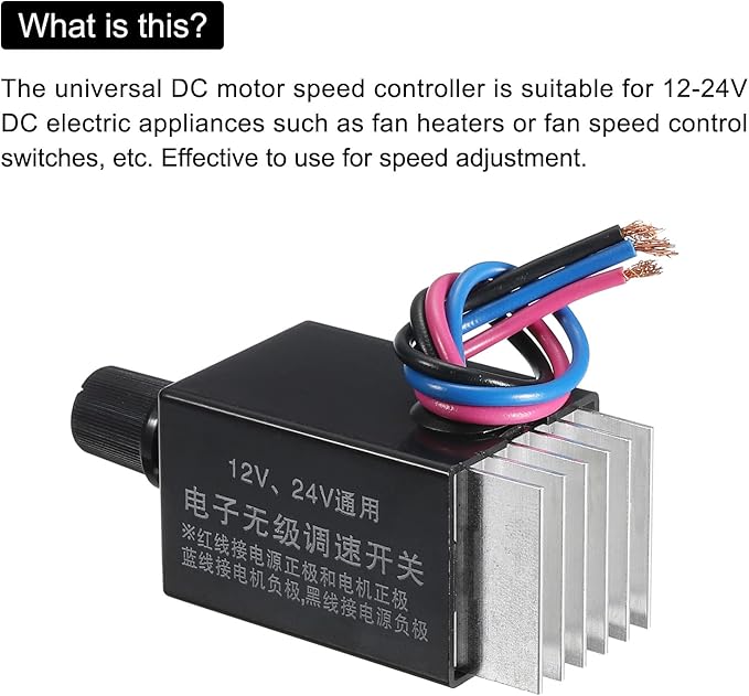 ユニバーサルDCモーター速度コントローラーは、ファンヒーターやファン速度制御スイッチなどの12-24V DC電化製品に適しています。速度調整に使用すると効果的です。