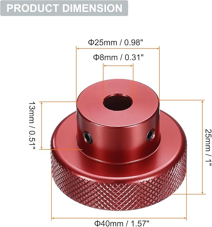 サイズ - 外径: 40mm、ボア: 8mm、高さ: 25mm。軸を固定するための2本のネジが付属しており、より確実な固定を保証します。