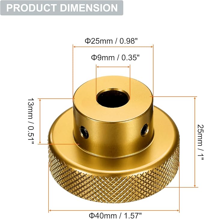 サイズ - 外径: 40mm、ボア: 9mm、高さ: 25mm。軸を固定するための2本のネジが付属しており、より確実な固定を保証します。